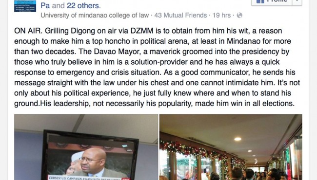 ON AIR. Grilling Digong on air via DZMM is to obtain from him his wit, a reason enough to make him a top honcho in political arena, at least in Mindanao for more than two decades. The Davao Mayor, a maverick groomed into the presidency by those who truly believe in him is a solution-provider and he has always a quick response to emergency and crisis situation. As a good communicator, he sends his message straight with the law under his chest and one cannot intimidate him. It’s not only about his political experience, he just fully knew where and when to stand his ground.His leadership, not necessarily his popularity, made him win in all elections.