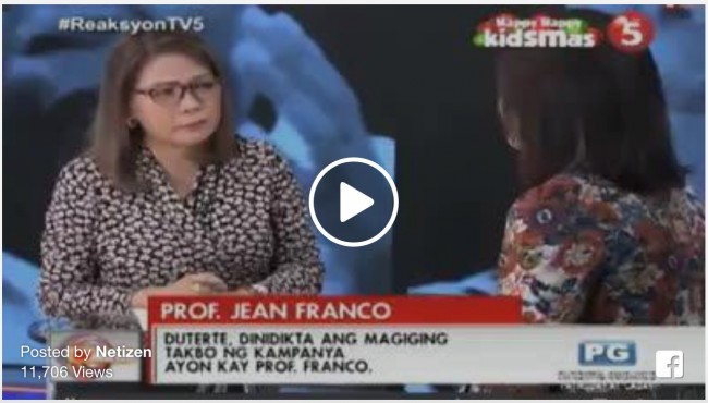 NewsStories Who’s the Real Winner in the Political Rivalry between Roxas and Duterte Slapping Contest By Angelo M. - December 17, 2015 0 460 FacebookTwitterPinterestWhatsApp https://www.facebook.com/PostMoShareMo777/videos/201481496858876/ Interview with Prof. Jean Franco of UP. [TV5]