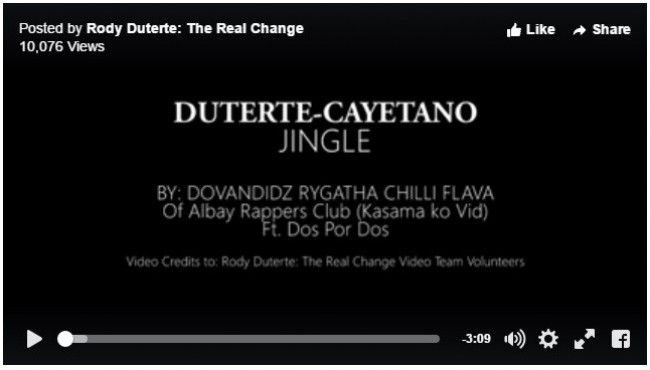 We would like to share this Duterte-Cayetano jingle composed by talented amateur rap artists, who call themselves Dovandidz Rygatha Chilli Flava of Albay Rappers Club featuring DOS Por DOS. They are just one of the several budding artists who share their talents in their own humble and unselfish ways in support of Duterte-Cayetano election bid. Such an inspiring gesture that is worthy of emulation.