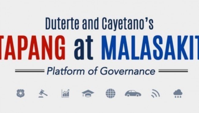 TAPANG: There is lawlessness, there is crime everywhere. Illegal drugs use is rampant. The people are clamoring for a leader that will bring peace and order. We promise to suppress crime, corruption and drugs in 3–6 months. Furthermore, Tapang represents the will to enforce and implement the existing laws of the land affecting all facets of our lives. We believe that the root causes of all the problems facing our country are the lack of enforcement of the law and a broken system in which these laws are promulgated. We needTapang to implement the law and fix the broken system.