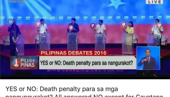 NewsStories #PiliPinasDebates2016: Death Penalty for Corrupt Officials? Only Cayetano answered ‘YES’! By Angelo M. - April 11, 2016 0 274 FacebookTwitterPinterestWhatsApp