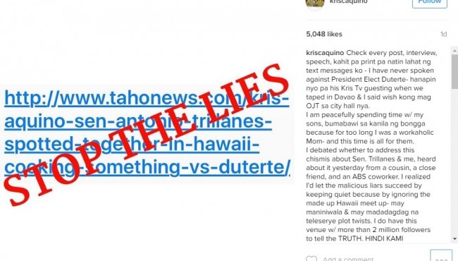 NewsStories Kris Aquino denies meetup with Sen. Trillanes in Hawaii! By Ella Canave - May 30, 2016 0 206 FacebookTwitterPinterestWhatsApp