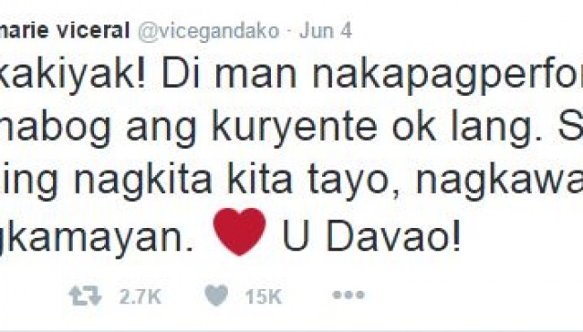 Vice Ganda wrote on his Twitter account: “Nakakiyak! Di man nakapagperform dhil sumabog ang kuryente ok lang. Sapat na saking nagkita kita tayo, nagkawayan at nagkamayan.”