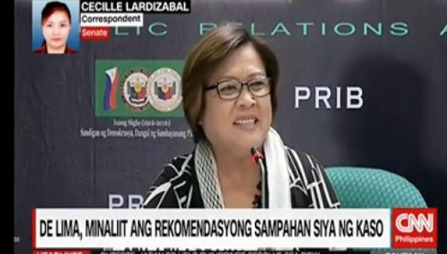NewsStories De Lima, minaliit ang rekomendasyong sampahan siya ng kaso By Trending.ph Staff - October 27, 2016 0 454 FacebookTwitterPinterestWhatsApp De Lima, minaliit ang rekomendasyong sampahan siya ng kaso https://www.facebook.com/CNNPhilippines/videos/1803043919935499/ Senador Leila De Lima, minaliit ang rekomendasyong sampahan siya ng kaso | CNN Philippines