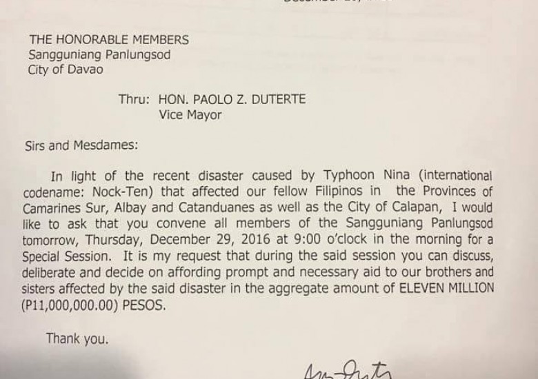 Following a special session Thursday morning, the Davao City Council approved the resolution allowing Mayor Inday Sara Duterte to use five percent of the LGUs Calamity Fund to help victims of the typhoon.