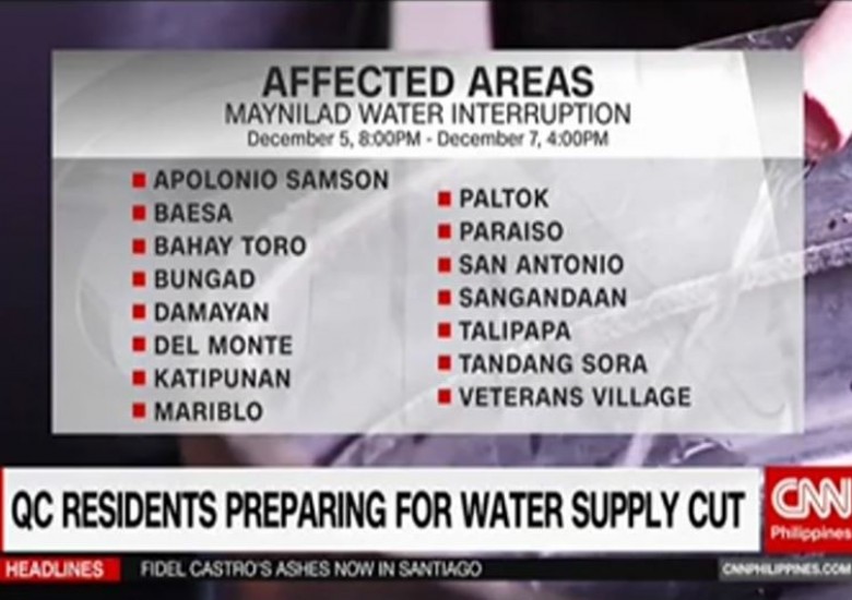 Videos Quezon City residents preparing for the two days water supply cut By Trending.ph Staff - December 4, 2016 0 438 FacebookTwitterPinterestWhatsApp https://www.facebook.com/CNNPhilippines/videos/1827082284198329/ Maynilad customers in some areas of Quezon City are gearing up for a two-day water interruption. | CNN Philippines