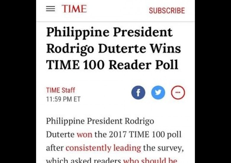 Videos President Duterte wins the Top spot for 2017 TIME 100 Reader Poll By Jimmer Ariate - April 17, 2017 0 421 FacebookTwitterPinterestWhatsApp