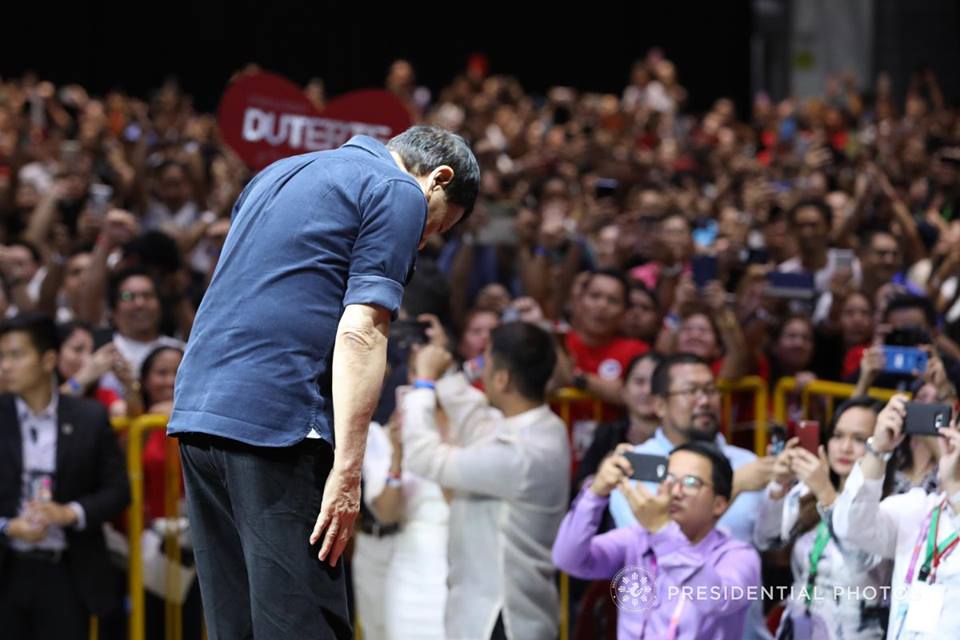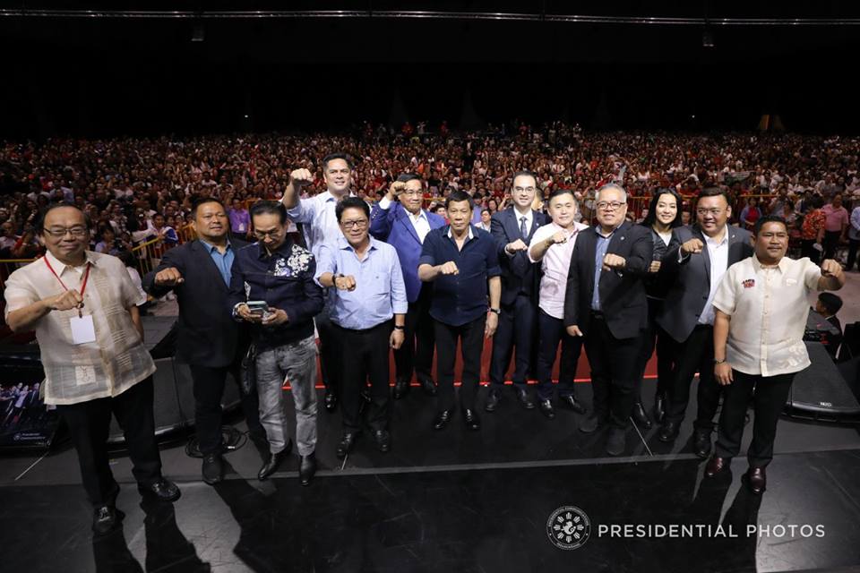 President Rodrigo Duterte strikes his signature pose with the members of his delegation after delivering his speech during the meeting with the Filipino community at the Big Box in Singapore on April 28, 2018.