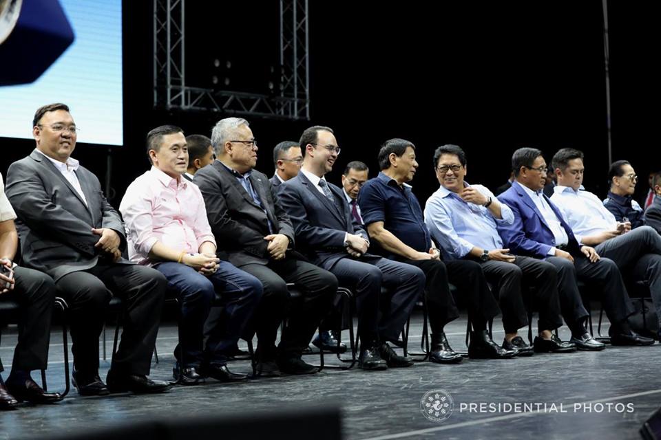 President Rodrigo Duterte chats with Labor and Employment Secretary Silvestre Bello III on the sidelines of the meeting with the Filipino community at the Big Box in Singapore on April 28, 2018. Also in the photo are Presidential Spokesperson Harry Roque, Sec. Bong Go of the Office of the Special Assistant to the President, Trade and Industry Secretary Ramon Lopez, Foreign Affairs Secretary Alan Peter Cayetano, Labor and Employment Secretary Silvestre Bello III, National Security Adviser Hermogenes Esperon Jr., Presidential Communications Secretary Martin Andanar and Chief Presidential Legal Counsel Salvador Panelo.