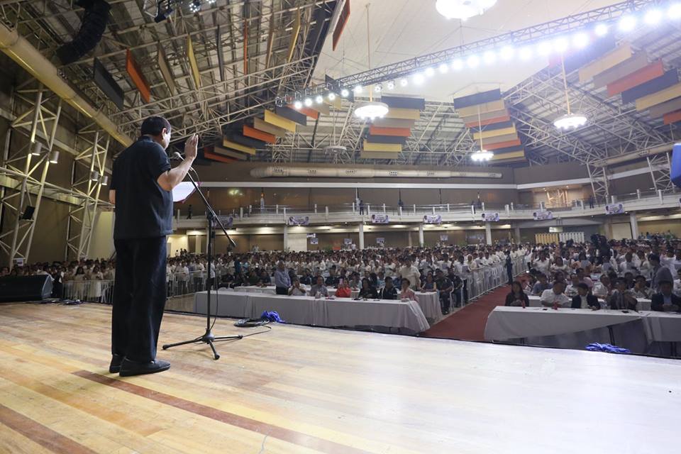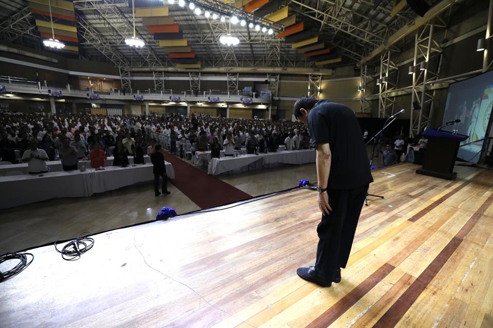 President Rodrigo Roa Duterte shows a gesture of respect to around 2,000 newly-elected barangay chairpersons in Northern Mindanao region during their oath-taking ceremony at the Atrium Convention Center in Cagayan de Oro City on June 25, 2018.