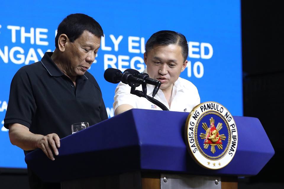 President Rodrigo Roa Duterte is assisted by Sec. Bong Go of the Office of the Special Assistant to the President as he delivers his speech during the oath-taking ceremony of the newly-elected barangay chairpersons in Northern Mindanao. The ceremony was held at the Atrium Convention Center in Cagayan de Oro City on June 25, 2018.