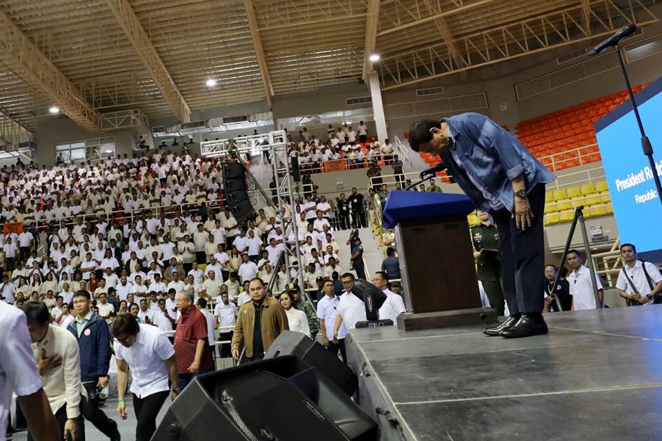 President Rodrigo Duterte bows as he takes center stage during the oath-taking ceremony of newly-elected barangay captains of Region IV-A (CALABARZON) at the Sta. Rosa Sports Complex in Sta. Rosa, Laguna on June 14, 2018.