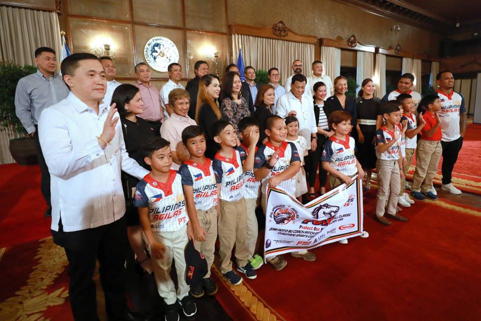 President Rodrigo Duterte and Sec. Bong Go of the Office of the Special Assistant to the President with the players from the Pilipinas Agilas as well as their parents and the coaching staff as they paid a courtesy call on the President at the Malacañan Palace on June 11, 2018. The Pilipinas Agilas are set to participate in the 2018 Pinto 8U Coach Pitch International Baseball Classic which is set on July 18 to 22 in Illinois, USA.