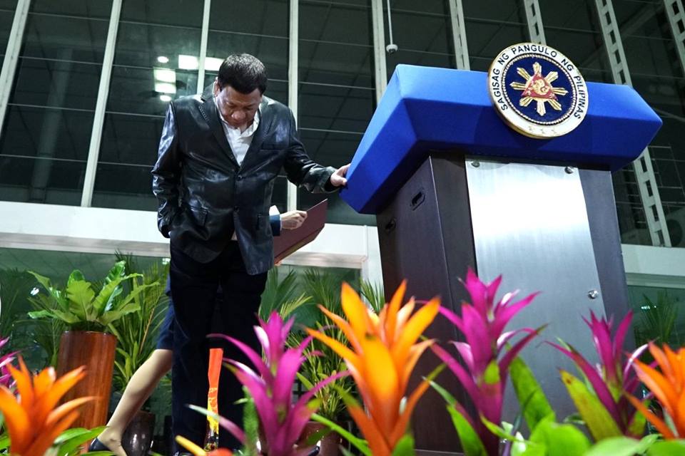 President Rodrigo Duterte bows before delivering his arrival statement at the Ninoy Aquino International Airport on June 5, 2018 following a successful three-day official visit to the Republic of Korea.