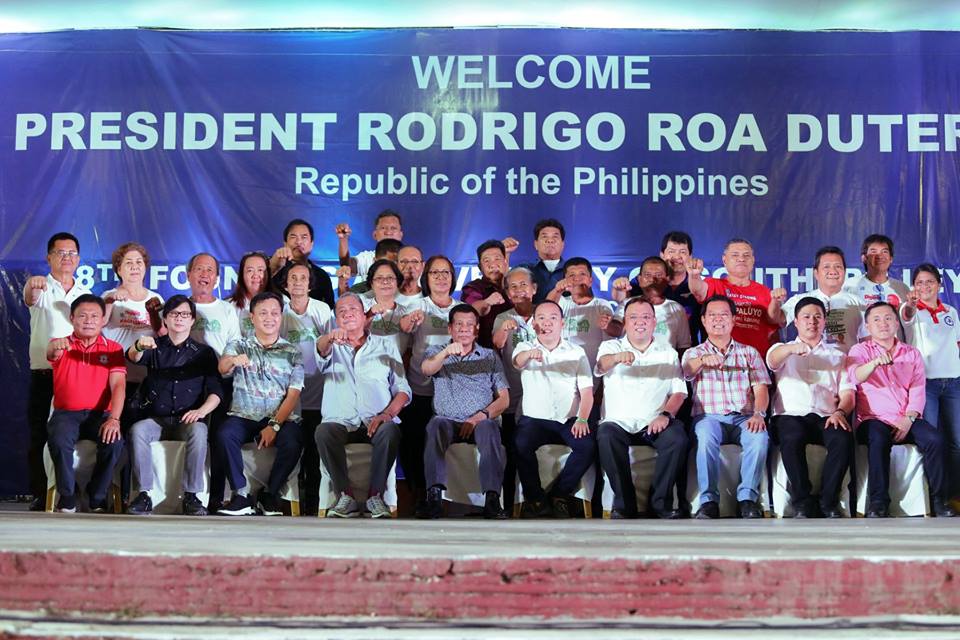 President Rodrigo Roa Duterte strikes his signature pose with the guests during the 58th founding anniversary of the province of Southern Leyte at the Provincial Capitol Grounds in Maasin City on July 2, 2018. Joining the President are Presidential Assistant for the Visayas Michael Dino, Presidential Adviser for Political Affairs Francis Tolentino, Transportation Secretary Arthur Tugade, Southern Leyte Governor Christopherson Yap, Presidential Spokesperson Harry Roque, Southern Leyte Representative Roger Mercado, Maasin City Mayor Nacional Mercado, and Sec. Bong Go of the Office of the Special Assistant to the President.