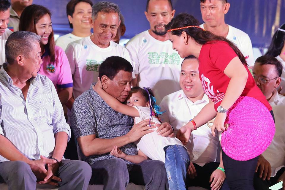 President Rodrigo Roa Duterte is embraced by the child of one of the guests during the 58th founding anniversary of the province of Southern Leyte at the Provincial Capitol Grounds in Maasin City on July 2, 2018. Also in the photo are Transportation Secretary Arthur Tugade and Southern Leyte Governor Christopherson Yap.