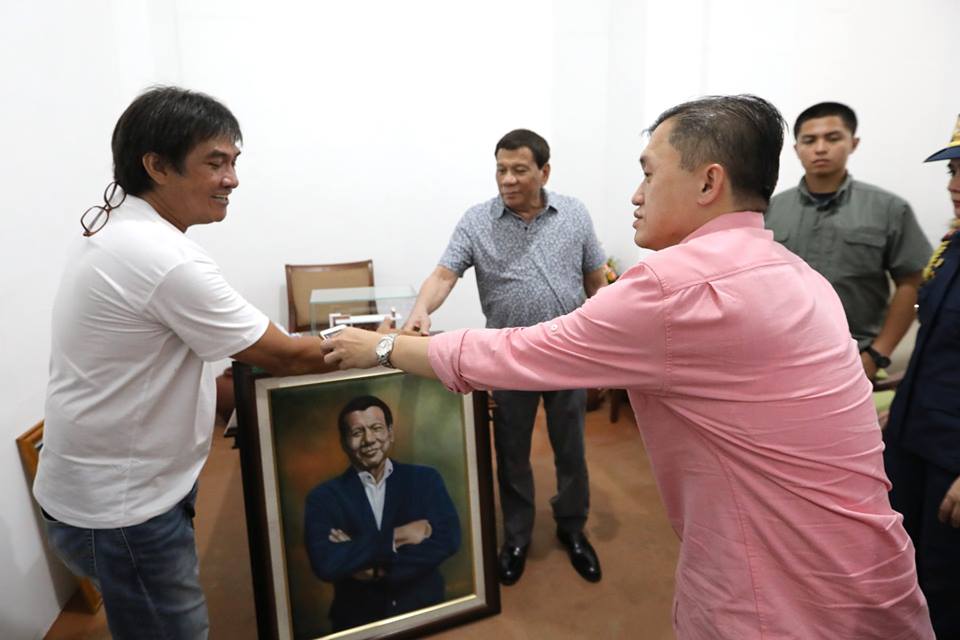 President Rodrigo Roa Duterte gets a portrait painting of himself as a token on the sidelines of his attendance to the 58th founding anniversary of the province of Southern Leyte at the Provincial Capitol Grounds in Maasin City on July 2, 2018. Joining the President is Sec. Bong Go of the Office of the Special Assistant to the President.