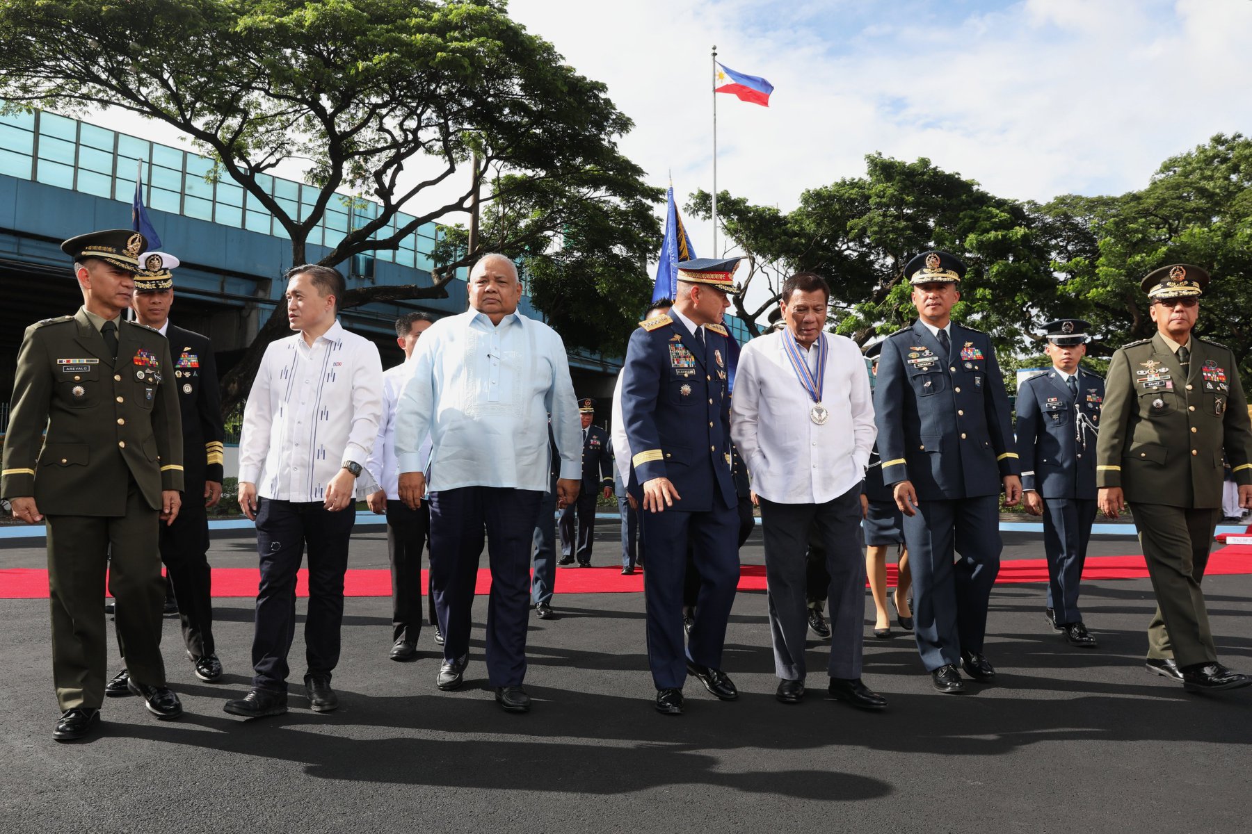 President Rodrigo Roa Duterte is accompanied by Sec. Bong Go of the Office of the Special Assistant to the President, Executive Secretary Salvador Medialdea, Philippine National Police Director General Oscar Albayalde, Philippine Air Force (PAF) Commander Galileo Kintanar, Jr., and Armed Forces of the Philippines Chief of Staff General Carlito Galvez, Jr. during the 71st founding anniversary of PAF at the Multi-Purpose Gymnasium in Colonel Jesus Villamor Air Base (CJVAB), Pasay City on July 3, 2018.