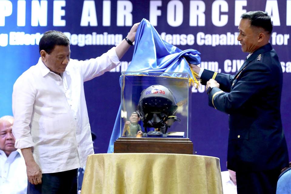 President Rodrigo Roa Duterte receives a fighter pilot's helmet as token during the 71st founding anniversary of the Philippine Air Force (PAF) at the Multi-Purpose Gymnasium in Colonel Jesus Villamor Air Base (CJVAB), Pasay City on July 3, 2018. Presenting the token is PAF Commander Lieutenant General Galileo Kintanar, Jr.