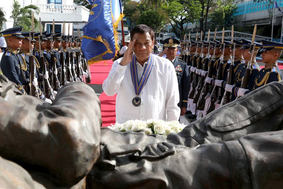 President Rodrigo Roa Duterte salutes the Fallen Airman Monument after laying a wreath to honor the memory of the fallen airmen of the Philippine Air Force (PAF) during the 71st founding anniversary of PAF at the Multi-Purpose Gymnasium in Colonel Jesus Villamor Air Base (CJVAB), Pasay City on July 3, 2018.