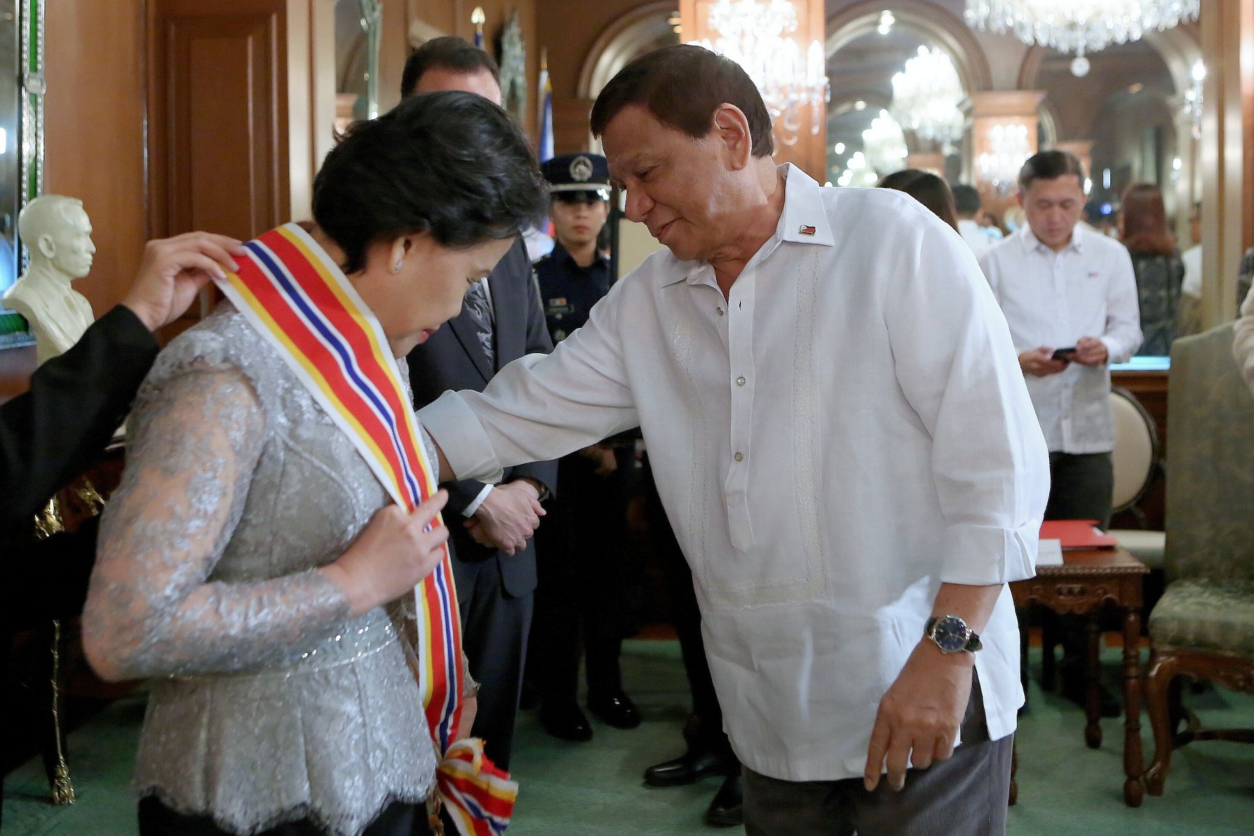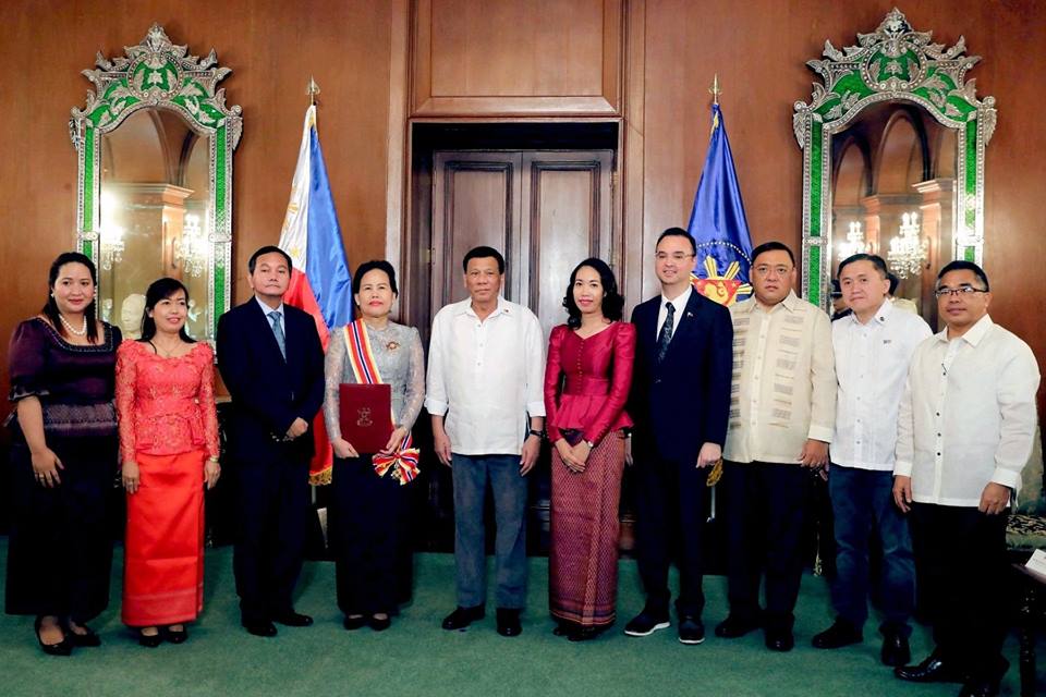 President Rody Duterte confers the Order of Sikatuna on outgoing Ambassador of Cambodia to the Philippines Tuot Panha, who paid a farewell call on the President at the Malacañan Palace on July 11, 2018. The Order of Sikatuna was conferred on the Cambodian Ambassador for her role in “facilitating high-level visits and meetings, for her dedicated efforts for further strengthening cooperation to promote greater peace, progress, and prosperity for our peoples, countries, and region, for helping bring closer the peoples of the Republic of the Philippines and the Kingdom of Cambodia in greater friendship, understanding, and mutual respect.