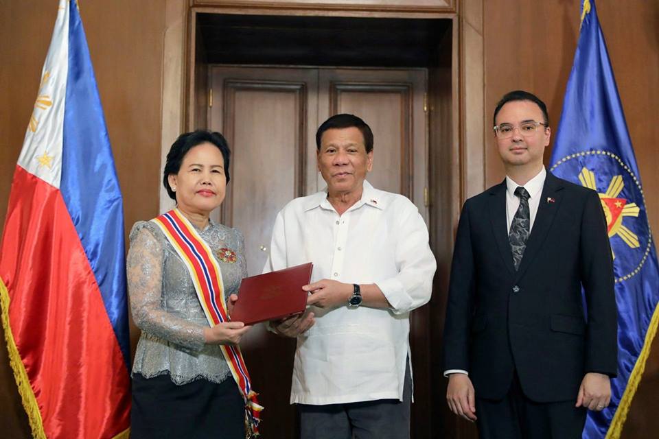 President Rodrigo Roa Duterte confers the Order of Sikatuna with rank of Datu on outgoing Ambassador of Cambodia to the Philippines Tuot Panha, who paid a farewell call on the President at the Malacañan Palace on July 11, 2018. Also in the photo is Foreign Affairs Secretary Alan Peter Cayetano.