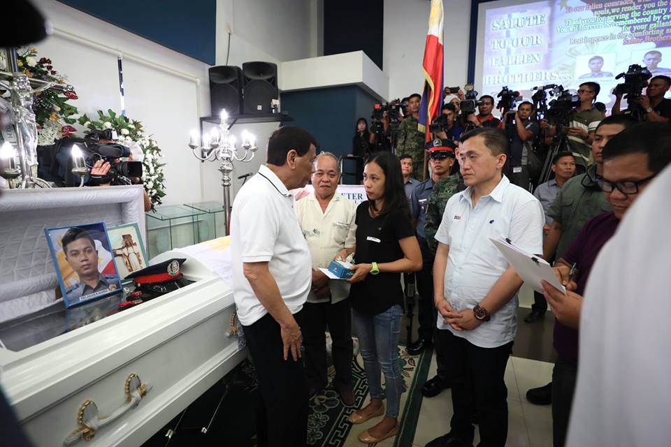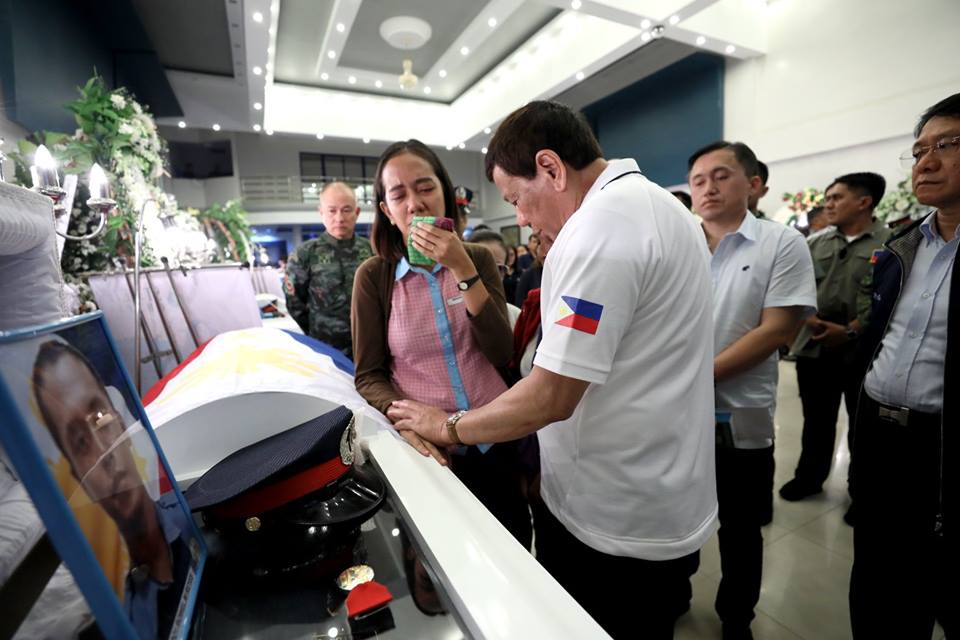 President Rodrigo Roa Duterte commiserates with the kin of the late PO1 Julius Suarez, one of the police officers, who were killed in an alleged misencounter with troops from the Philippine Army in Samar on June 25, 2018. The President visited the wake of the killed police officers at the Police Regional 8 Headquarters in Camp Ruperto Kangleon, Palo, Leyte on June 29, 2018. Also in the photo is Sec. Bong Go of the Office of the Special Assistant to the President.