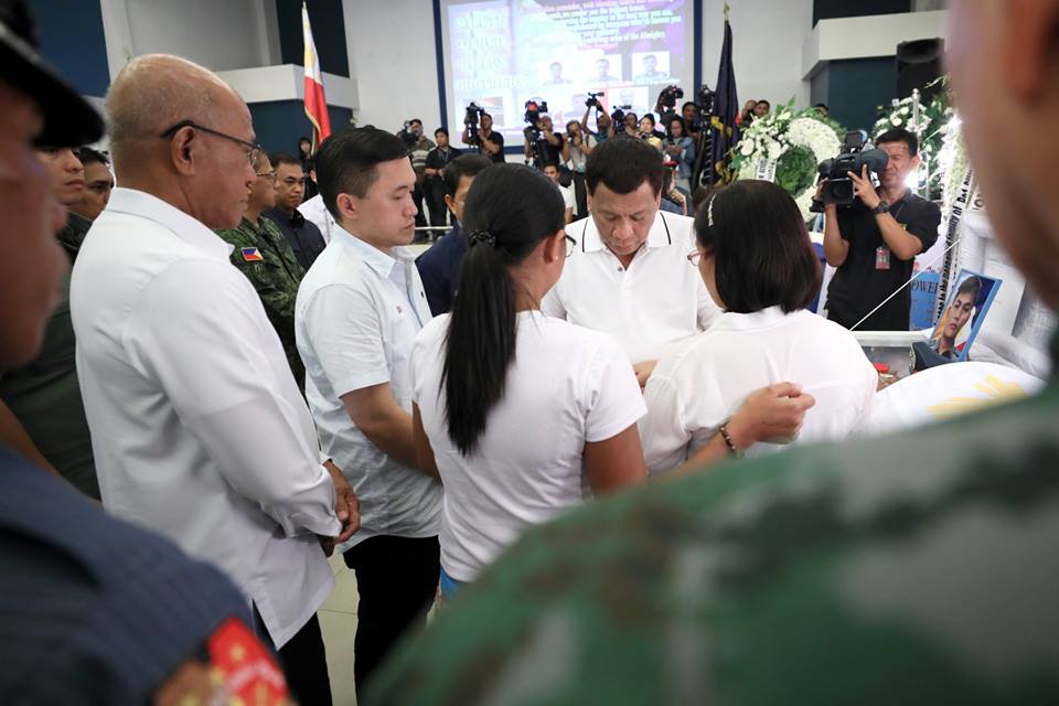 President Rodrigo Roa Duterte commiserates with the kin of the late P01 Phil Mendigo, one of the police officers, who were killed in an alleged misencounter with troops from the Philippine Army in Samar on June 25, 2018. The President visited the wake of the killed police officers at the Police Regional 8 Headquarters in Camp Ruperto Kangleon, Palo, Leyte on June 29, 2018. Also in the photo are Defense Secretary Delfin Lorenzana and Sec. Bong Go of the Office of the Special Assistant to the President.