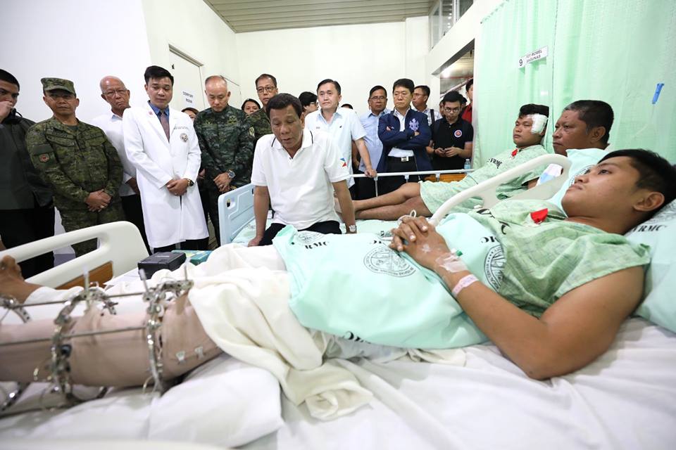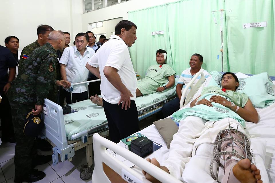 President Rodrigo Roa Duterte checks the condition of the wounded police officers confined at the Eastern Visayas Regional Medical Center in Tacloban City, Leyte on June 29, 2018. Nine police officers were wounded in an alleged misencounter with troops from the Philippine Army in Samar on June 25, 2018. Also in the photo is Sec. Bong Go of the Office of the Special Assistant to the President.
