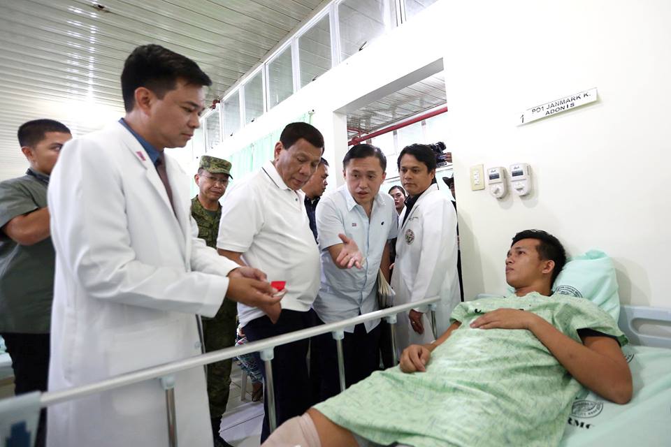President Rodrigo Roa Duterte and Sec. Bong Go of the Office of the Special Assistant to the President check the condition of PO1 Janmark Adonis, one of the wounded police officers confined at the Eastern Visayas Regional Medical Center in Tacloban City, Leyte on June 29, 2018. Nine police officers were wounded in an alleged misencounter with troops from the Philippine Army in Samar on June 25, 2018.
