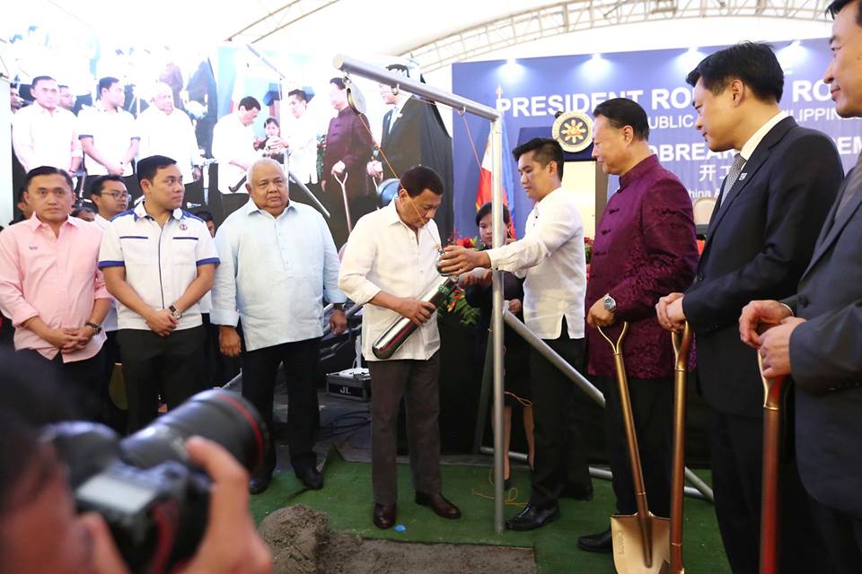 President Rody Duterte leads the groundbreaking ceremony of the Binondo-Intramuros Bridge and Estrella-Pantaleon Bridge in Intramuros, Manila on July 17, 2018. In his speech, the President expressed his gratitude to China for funding the construction of the bridges. The projects, under the Build, Build, Build program, are set for completion in 2020