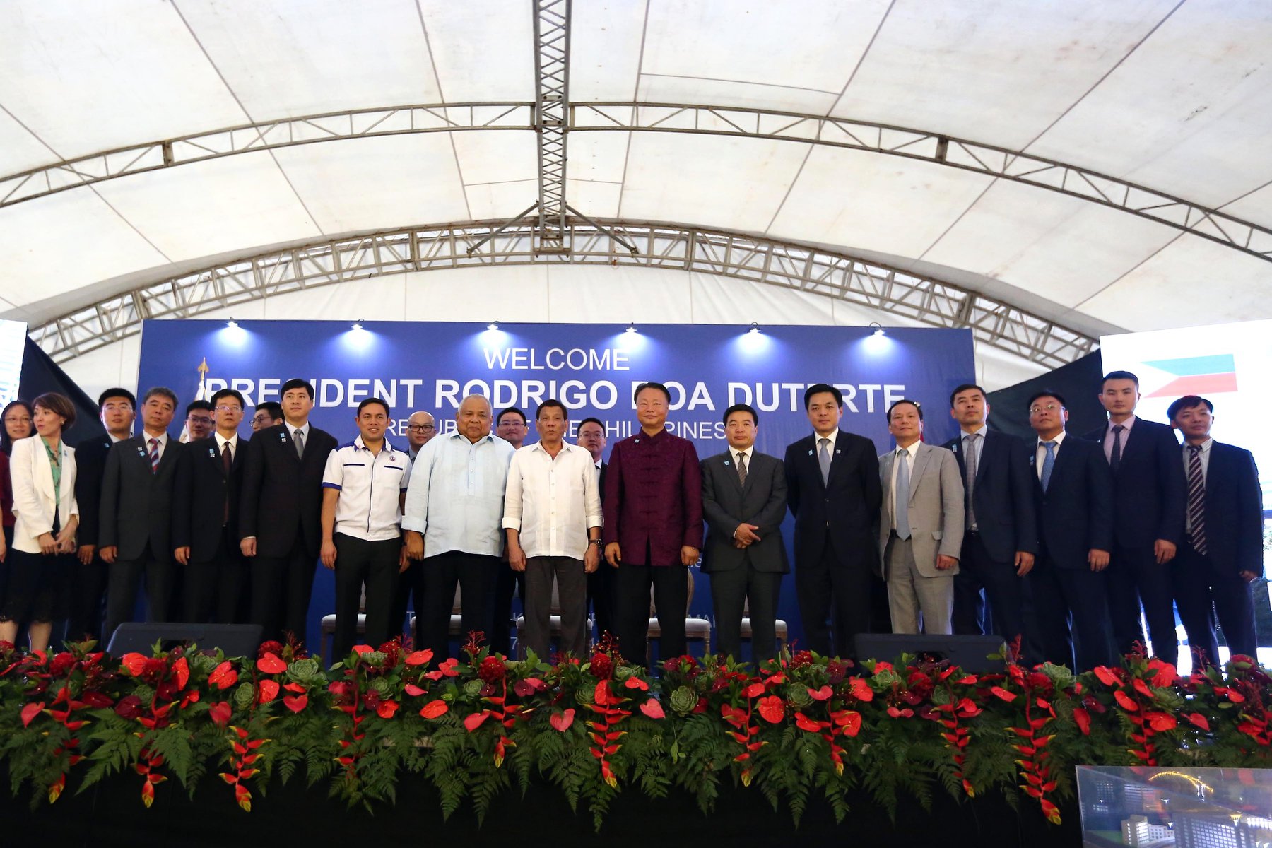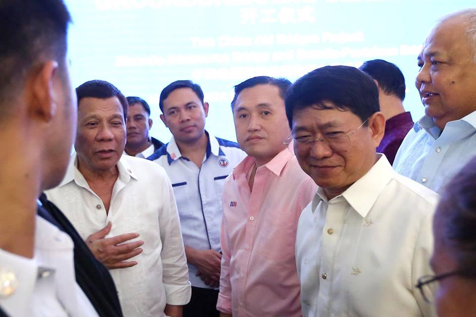President Rodrigo Roa Duterte poses for a photo with Public Works and Highways Secretary Mark Villar, Executive Secretary Salvador Medialdea, Chinese Ambassador to the Philippines Zhao Jianhua, and officials from the Chinese Communications Construction Corporation during the groundbreaking ceremony of the Binondo-Intramuros Bridge and Estrella-Pantaleon Bridge in Intramuros, Manila on July 17, 2018.