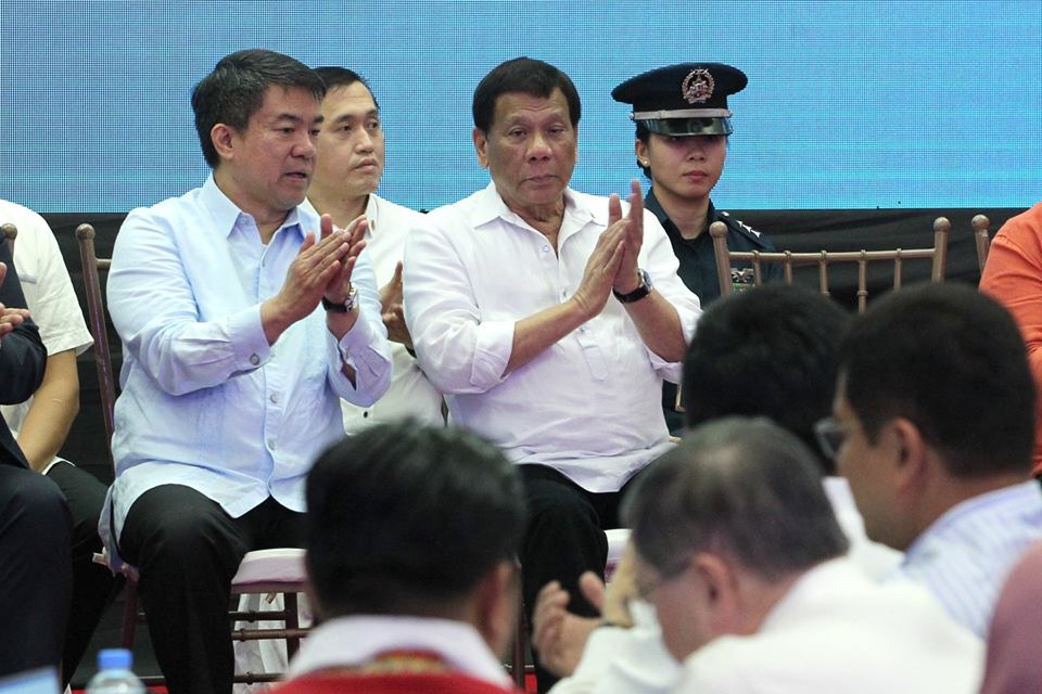 President Rodrigo Roa Duterte applauds as he witnesses the program proper during the first anniversary celebration of the Partido Demokratiko Pilipino-Lakas ng Bayan (PDP-Laban) Cares and the PDP-Laban Leaders’ Reunion at the Government Service Insurance System (GSIS) Building in Pasay City on August 15, 2018. Also in the photo is Senator Aquilino Pimentel III.