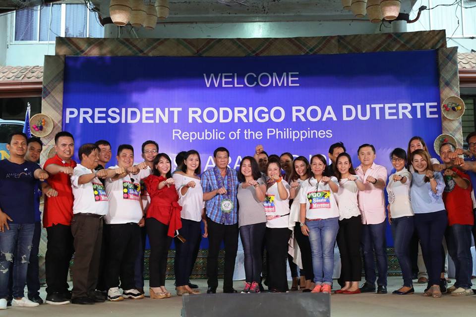 President Rodrigo Roa Duterte flashes his signature pose with Sec. Bong Go of the Office of the Special Assistant to the President and guests during the celebration of the ‘69th Araw ng Ipil’ at the Ipil Municipal Plaza in Zamboanga Sibugay Province on July 26, 2018.