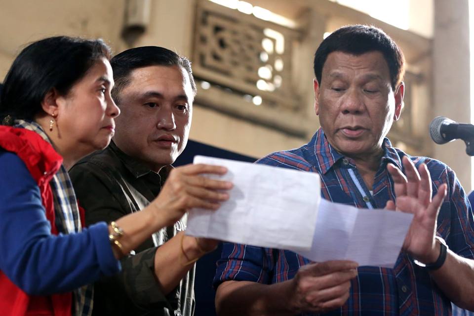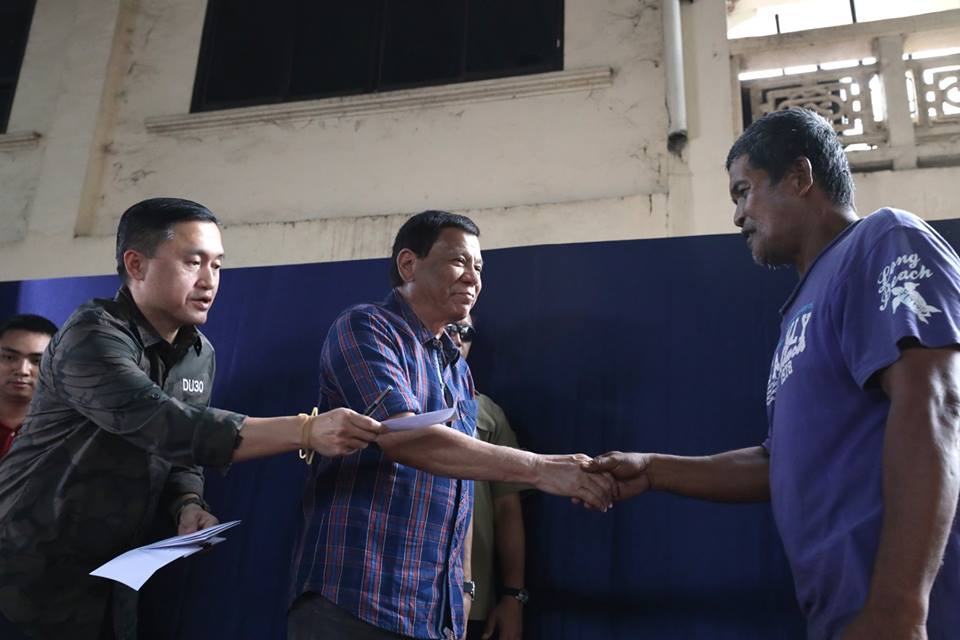 President Rodrigo Roa Duterte leads the ceremonial distribution of aid for the fire victims at the Municipal Hall of Jolo in Sulu on July 27, 2018. Assisting the President is Sec. Bong Go of the Office of the Special Assistant to the President.