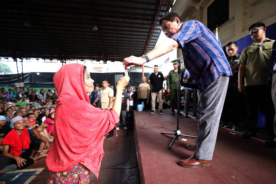 President Rodrigo Roa Duterte shows the medal for the Order of Lapu-Lapu with the Rank of Kampilan to one of the fire victims during the ceremonial distribution of aid at the Municipal Hall of Jolo in Sulu on July 27, 2018. After visiting the fire victims, the President proceeded to Camp Teodulfo Bautista Station Hospital to award the medal to the wounded soldiers.
