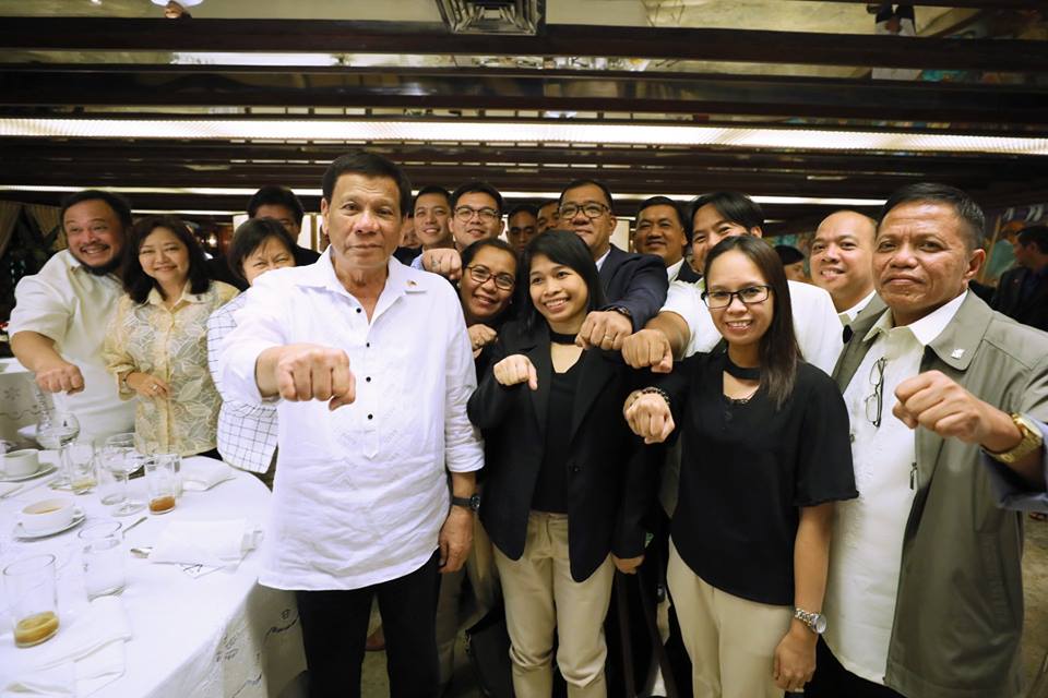 President Rodrigo Roa Duterte strikes his signature pose with the officers of the Kapisanan ng mga Brodkaster ng Pilipinas (KBP) during a dinner hosted by the President in Malacañan Palace on August 14, 2018.