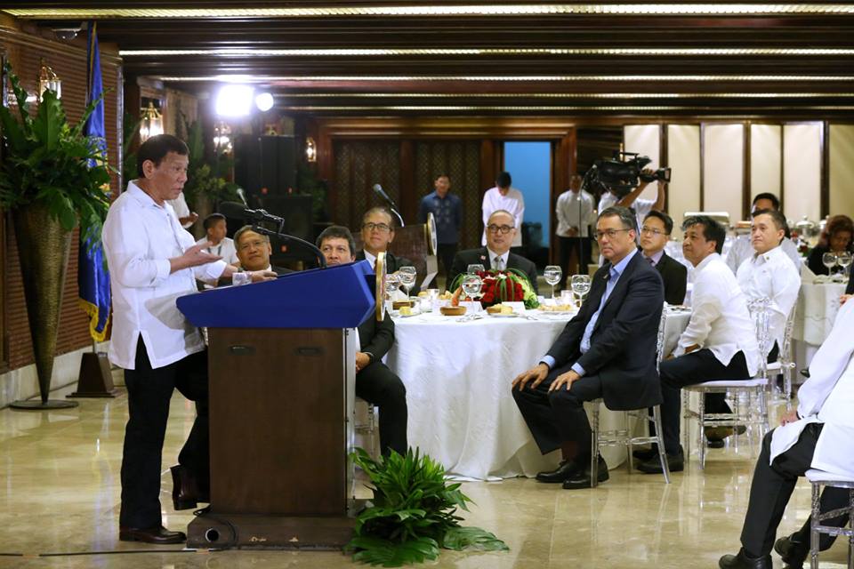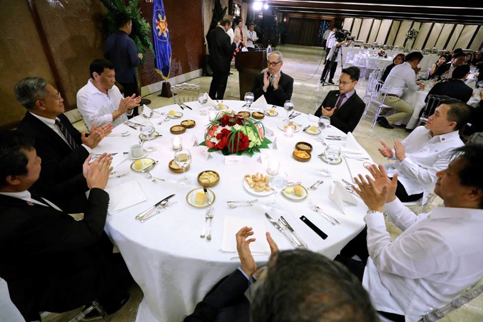President Rodrigo Roa Duterte applauds after Kapisanan ng mga Brodkaster ng Pilipinas (KBP) Chairman Ruperto Nicdao Jr. delivers his message during a dinner hosted by the President for the KBP in Malacañan Palace on August 14, 2018.