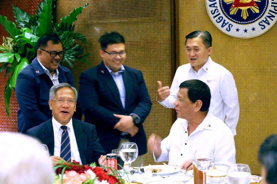 President Rodrigo Roa Duterte and Sec. Bong Go of the Office of the Special Assistant to the President share a light moment with Kapisanan ng mga Brodkaster ng Pilipinas (KBP) President Herman Basbaño and other officers of KBP during a dinner hosted by the President in Malacañan Palace on August 14, 2018.