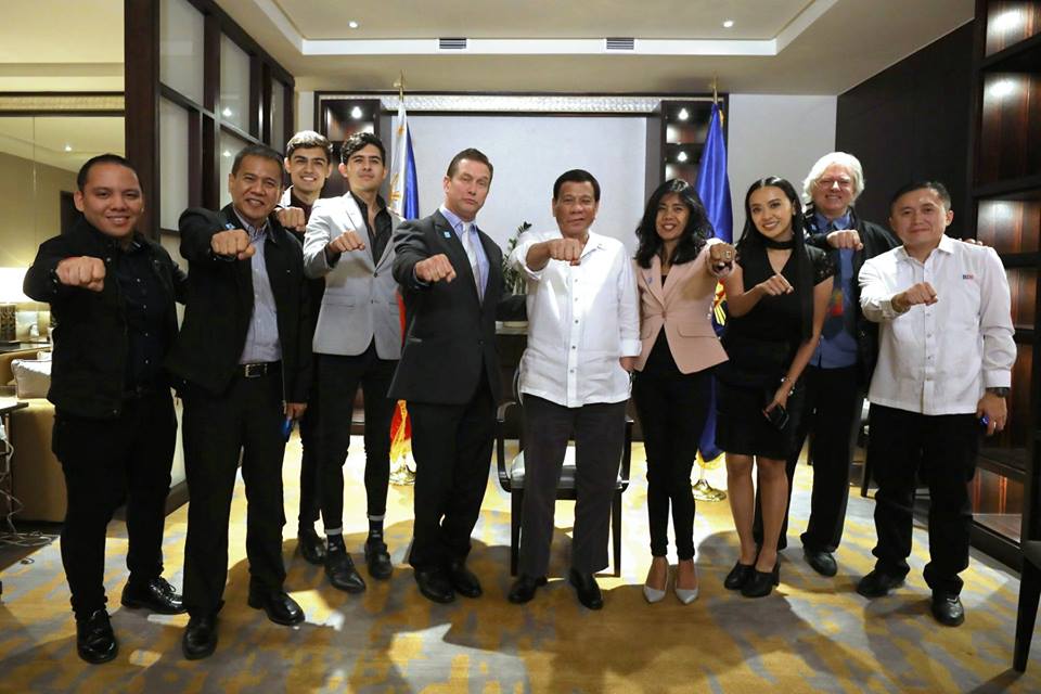 President Rodrigo Roa Duterte strikes his signature pose with Hollywood actor Stephen Baldwin, Presidential Communications Assistant Secretary Mocha Uson, Sec. Bong Go of the Office of the Special Assistant to the President, and the actors and staff of the upcoming movie 'Kaibigan' during a courtesy call on the President at the Grand Hyatt Hotel Manila on August 1, 2018.
