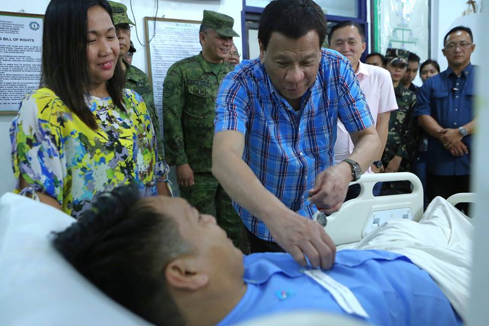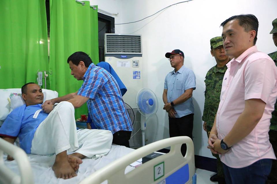 President Rodrigo Roa Duterte confers the Order of Lapu-Lapu with the Rank of Kampilan on Sergeant Yahcob Sarian as the President visited the wounded soldiers at Camp Navarro General Hospital in Zamboanga City on July 26, 2018. Sarian was wounded in an encounter with the Abu Sayyaf Group last July 11. Also in the photo is Sec. Bong Go of the Office of the Special Assistant to the President.