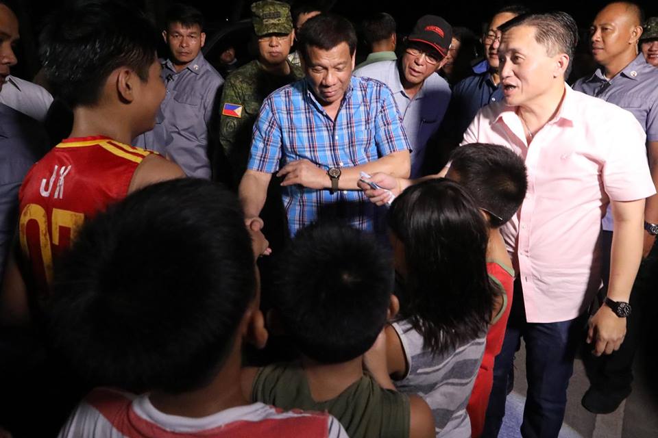 President Rodrigo Roa Duterte interacts with the children on the sidelines of his visit to the wounded soldiers at Camp Navarro General Hospital in Zamboanga City on July 26, 2018. Also in the photo are Armed Forces of the Philippines Chief of Staff General Carlito Galvez Jr., Defense Secretary Delfin Lorenzana, and Sec. Bong Go of the Office of the Special Assistant to the President.