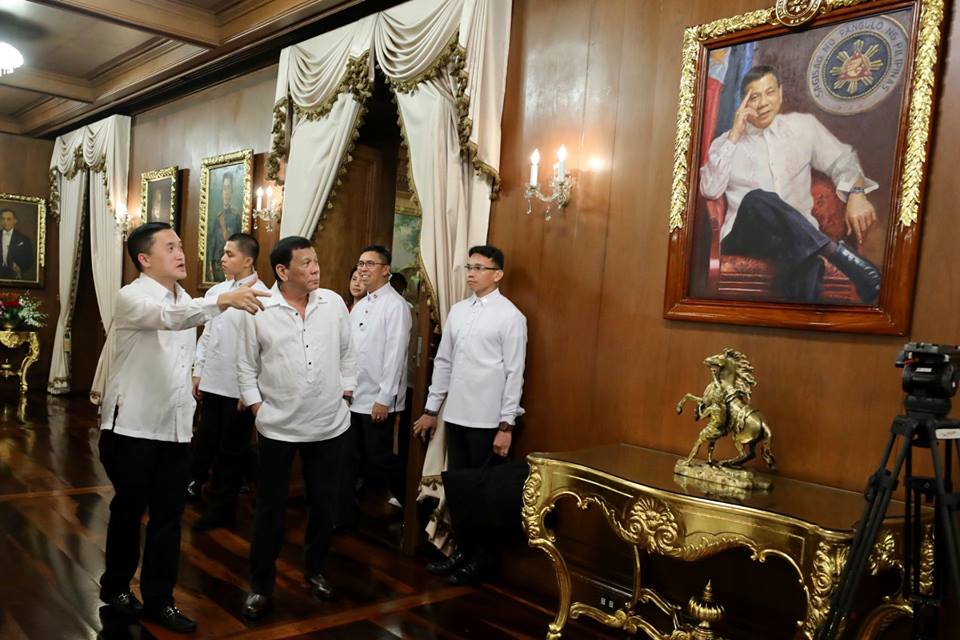 President Rodrigo Roa Duterte talks to Sec. Bong Go of the Office of the Special Assistant to the President while looking at his portrait painting mounted at the Reception Hall of Malacañan Palace on August 14, 2018.