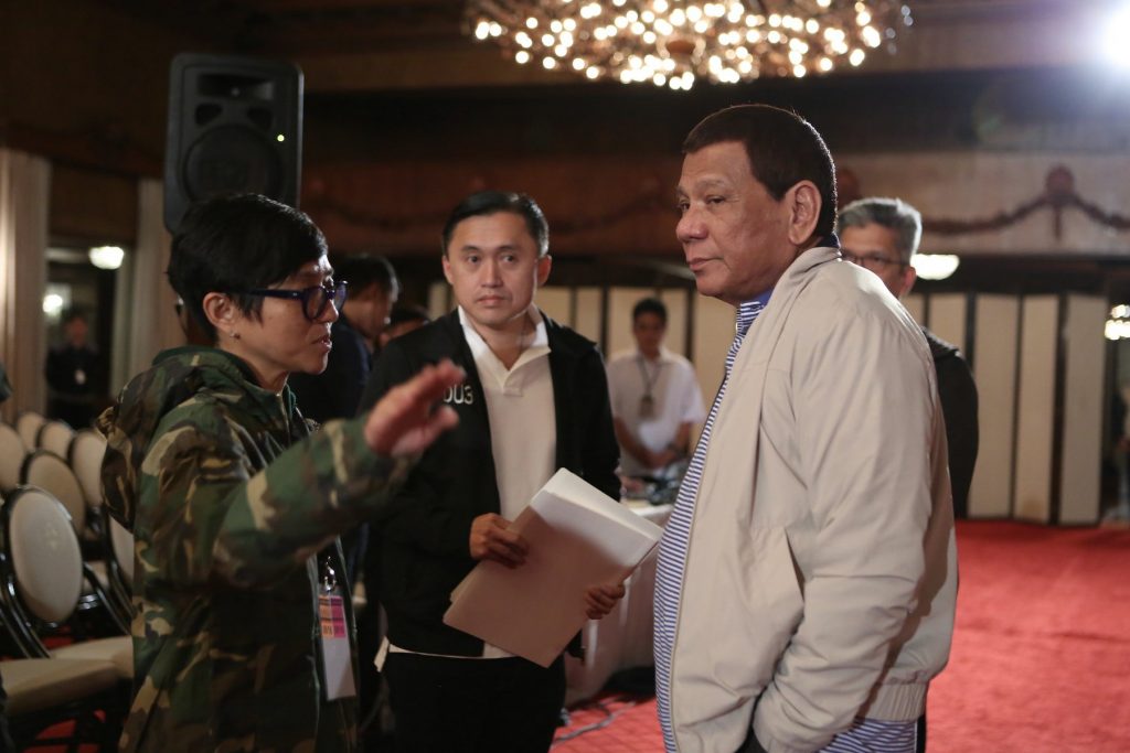 President Rody Duterte discusses matters with film director Joyce Bernal on July 22, 2018 as they make preparations for the President's third State of the Nation Address (SONA) at the Malacañan Palace. Joining the President is Sec. Christopher Bong Go of the Office of the Special Assistant to the President.