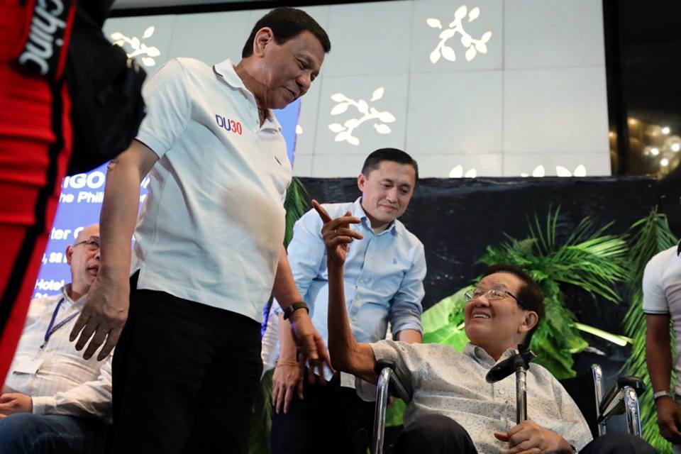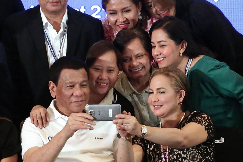 President Rodrigo Roa Duterte poses for a selfie with League of Municipalities of the Philippines (LMP) Socorro Mayor Maria Fe Brondial and other guests during the LMP Visayas Island Cluster Conference at the Radisson Blu Hotel in Cebu City on August 21, 2018.