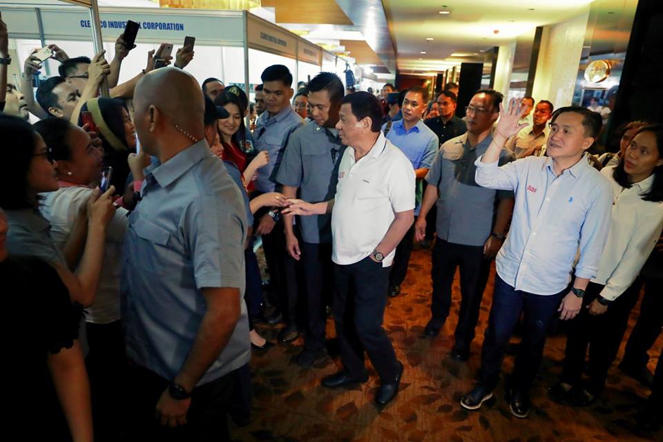 President Rodrigo Roa Duterte interacts with supporters upon his arrival at the Radisson Blu Hotel in Cebu City for his attendance at the League of Municipalities of the Philippines (LMP) Visayas Island Cluster Conference on August 21, 2018. Accompanying the President is Sec. Bong Go of the Office of the Special Assistant to the President.