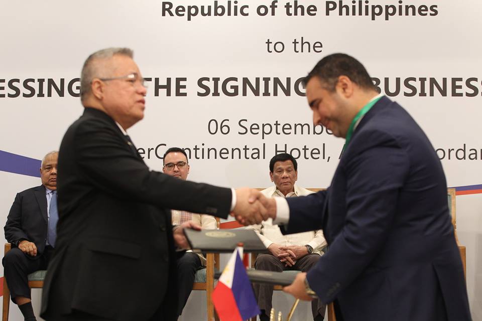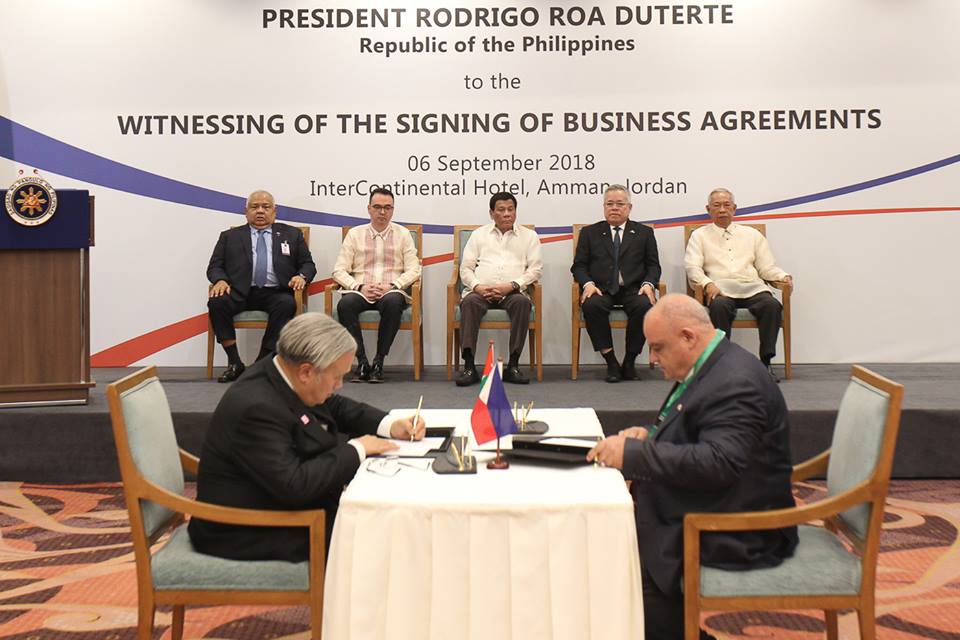 President Rodrigo Roa Duterte witnesses as Philippine Business Conference Chairman Jose Leviste Jr. signs the Memoranda of Understanding with Jordan Chamber of Industry Chairman Adnan Abu El Ragheb during the Business Forum held at the Intercontinental Hotel in Amman, Jordan on September 6, 2018. Joining the President are Executive Secretary Salvador Medialdea, Foreign Affairs Secretary Alan Peter Cayetano, Trade and Industry Secretary Ramon Lopez, and Ambassador of the Philippines to Jordan Akmad Sakkam. The MOU is an establishment of linkages between businesses and industrial sectors in the Philippines and Jordan to facilitate cooperation and joint ventures among members and to increase bilateral trade volume between the two countries.