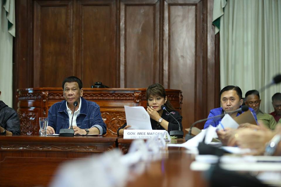 President Rodrigo Roa Duterte listens to the updates on the aftermath of Typhoon 'Ompong' during a situation briefing with the members of his cabinet and local government officials held at the Provincial Capitol in Laoag, Ilocos Norte on September 16, 2018. Also in the photo are Ilocos Norte Governor Imee Marcos and Secretary Christopher Lawrence 'Bong' Go of the Office of the Special Assistant to the President.