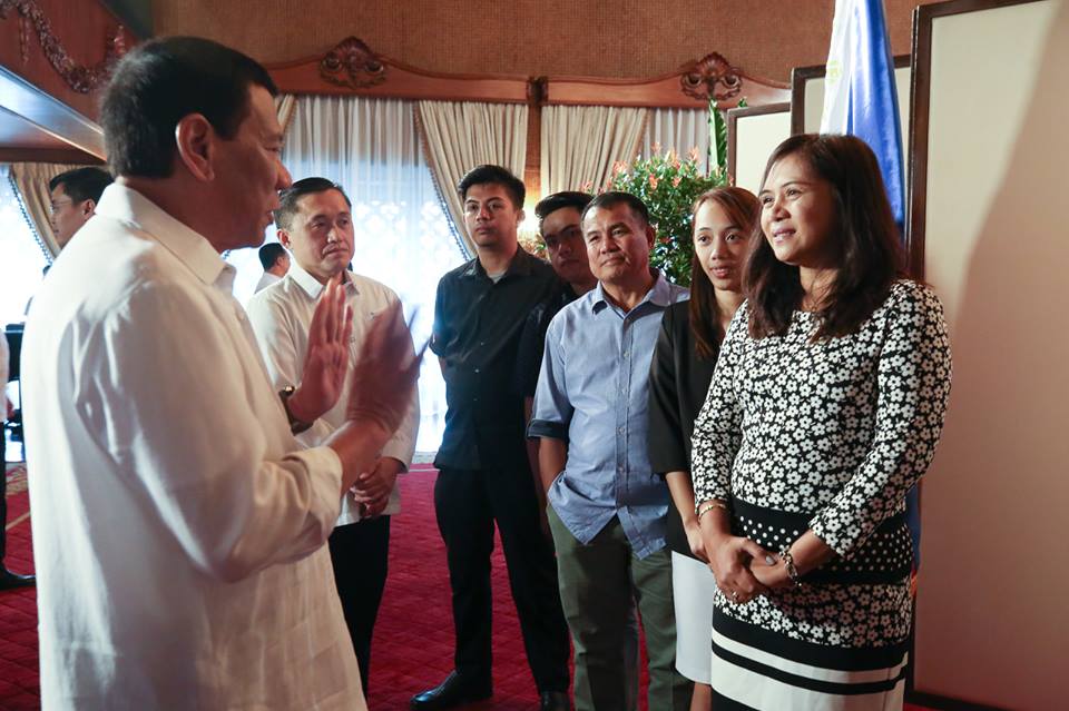 President Rodrigo Roa Duterte flashes his signature pose with Secretary Christopher Lawrence ‘Bong’ Go of the Office of the Special Assistant to the President and Lispeth Francisco and her family during a meeting at the Malacañan Palace on September 12, 2018. Francisco is the caregiver of the late Benzion Netanyahu, father of the State of Israel Prime Minister Benjamin Netanyahu.