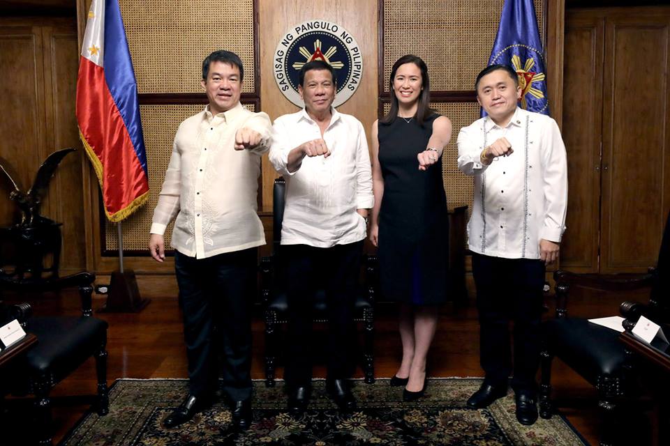 President Rodrigo Roa Duterte strikes his signature pose with Senator Aquilino Pimentel III, Kathryna Yu, and Secretary Christopher Lawrence 'Bong' Go of the Office of the Special Assistant to the President during a meeting at the Malacañan Palace on September 25, 2018.